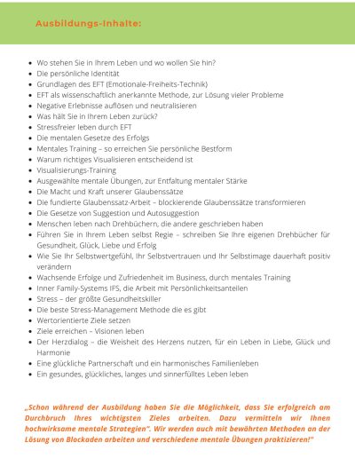 - Ein Ausbildungs-Team mit hoher Fachkompetenz, Empathie, Herzlichkeit und einem wertschätzenden Umgang mit den TeilnehmerInnen
